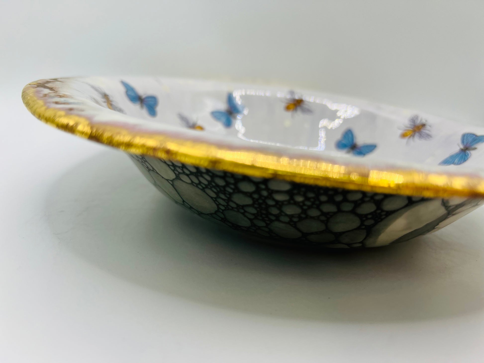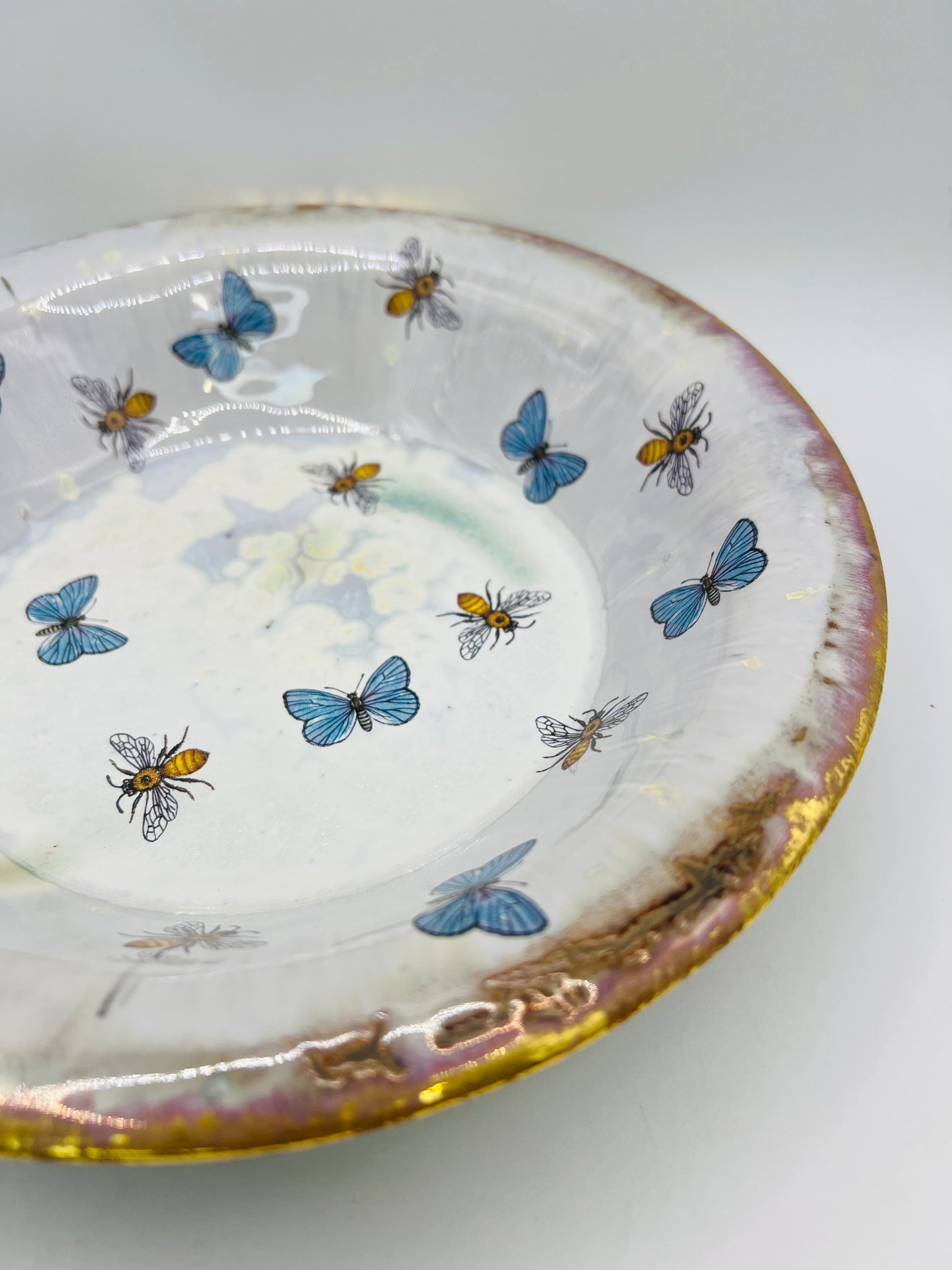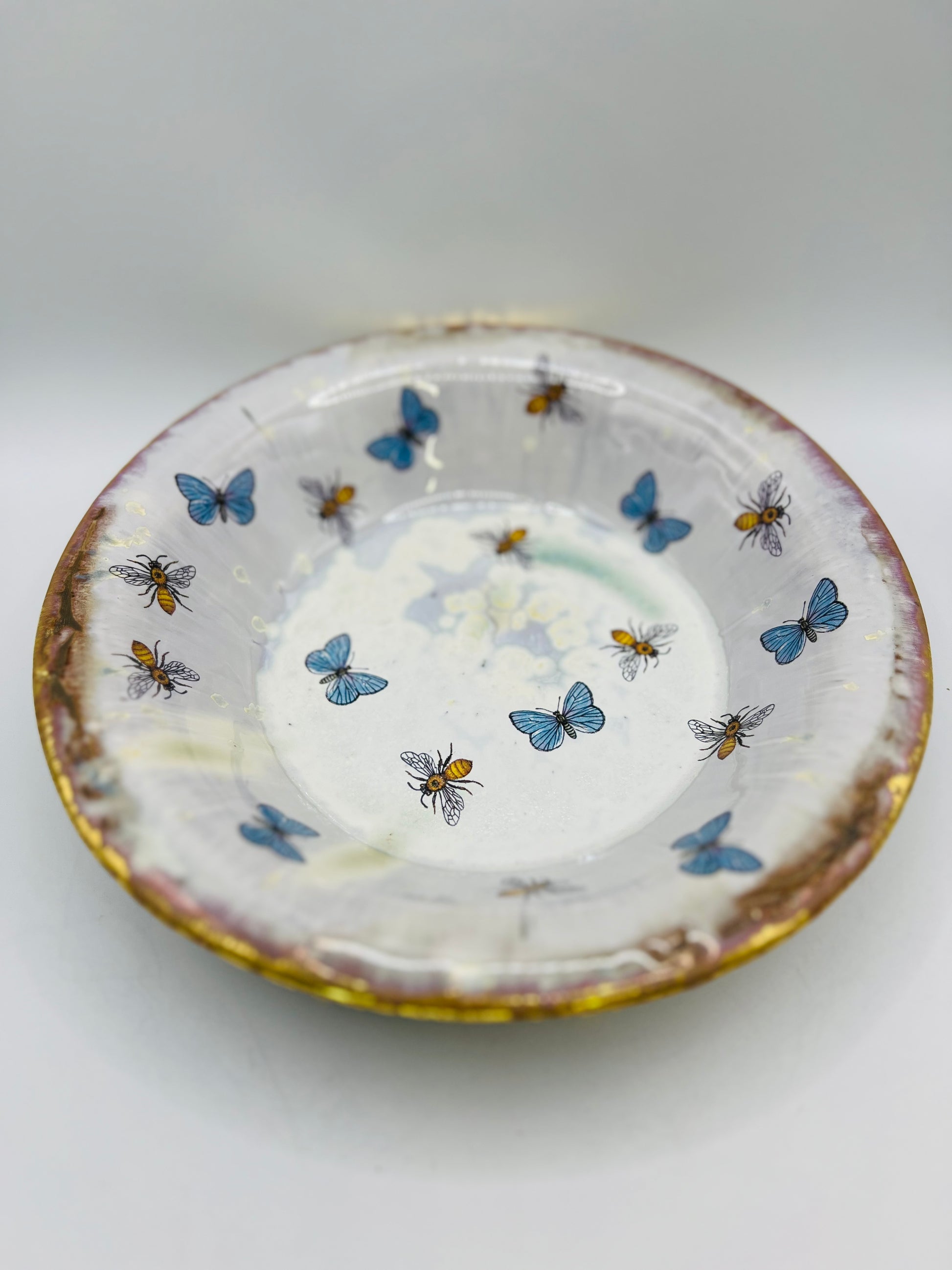 Howdy folks! I’ve pulled this bowl out of the kiln and I LOVE it…lots! There’s some real sexy glaze going on and obviously, as you all know, I’m partial to a bee and a butterfly!