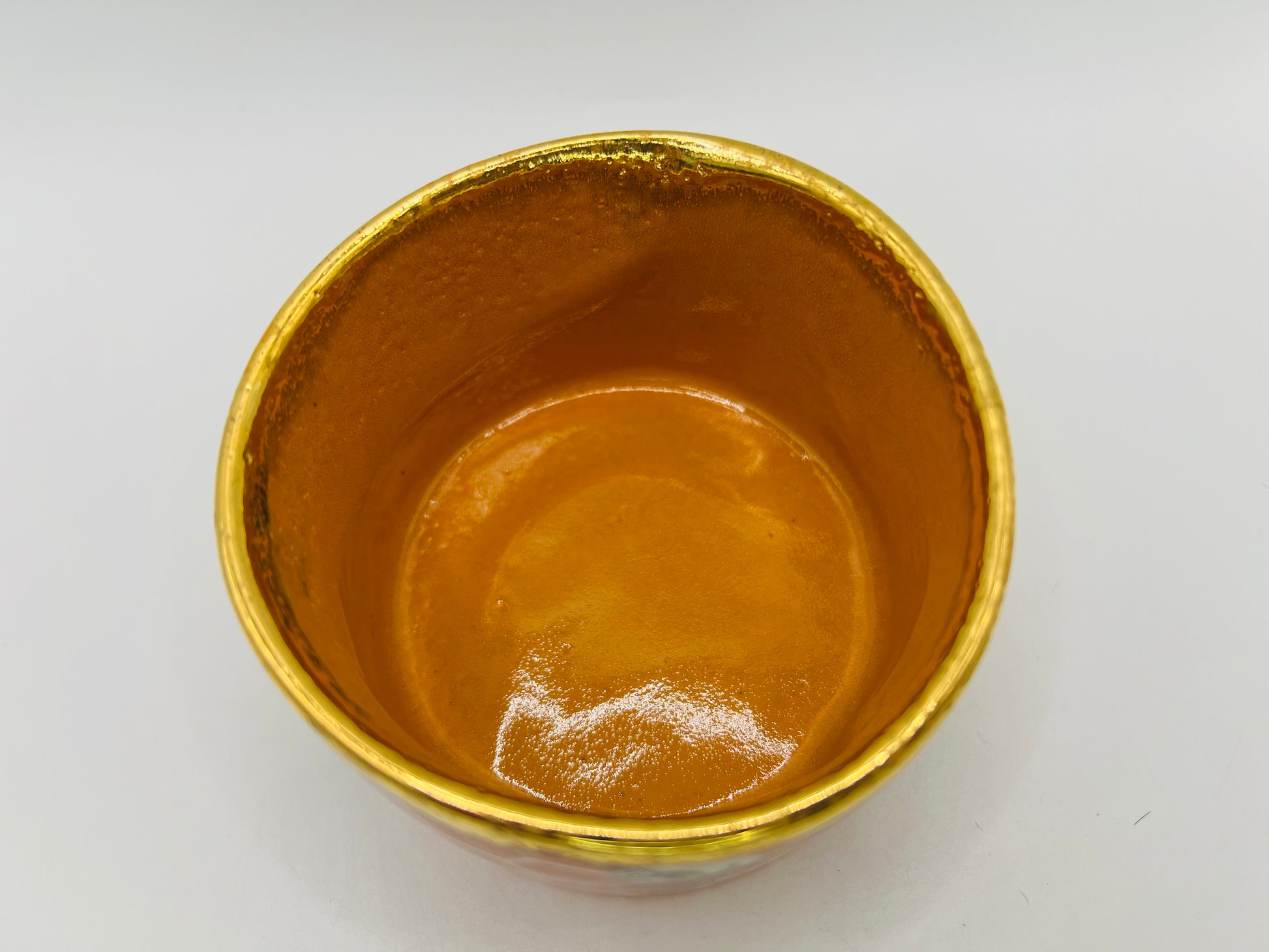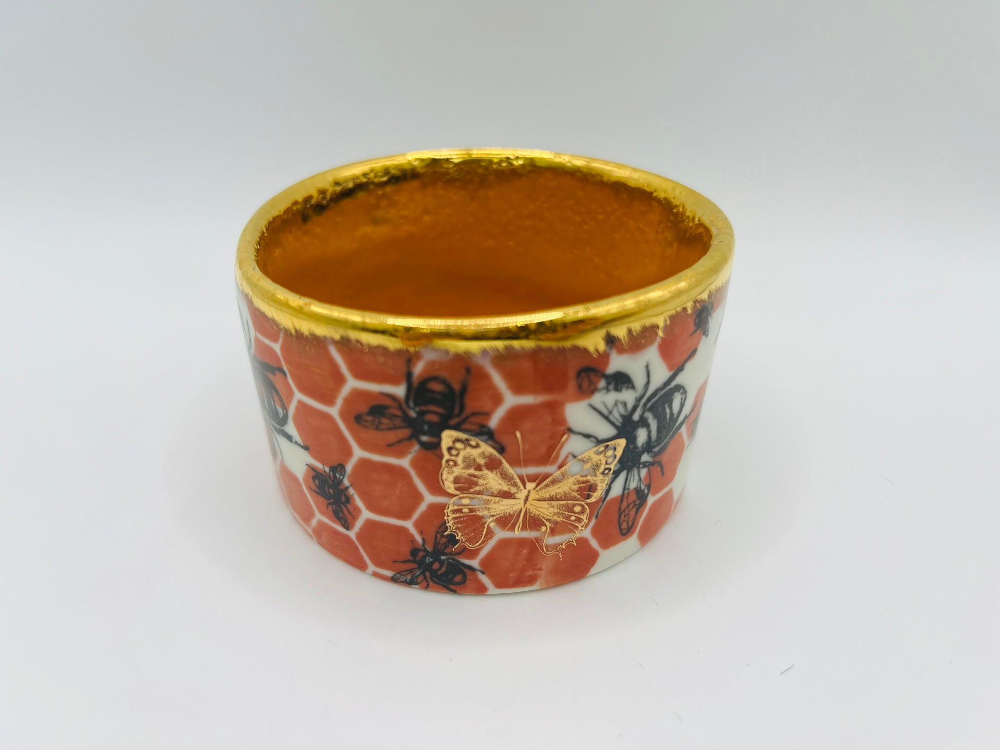 We've got all sorts going on for the decoration of this one; ALL SORTS I SAY! Beautiful 24 karat gold decals, screen-printed honeycomb pattern, beautiful golden yellow/orange glaze inside, a 24 karat gold rim and some lovely gold lustre smatterings!