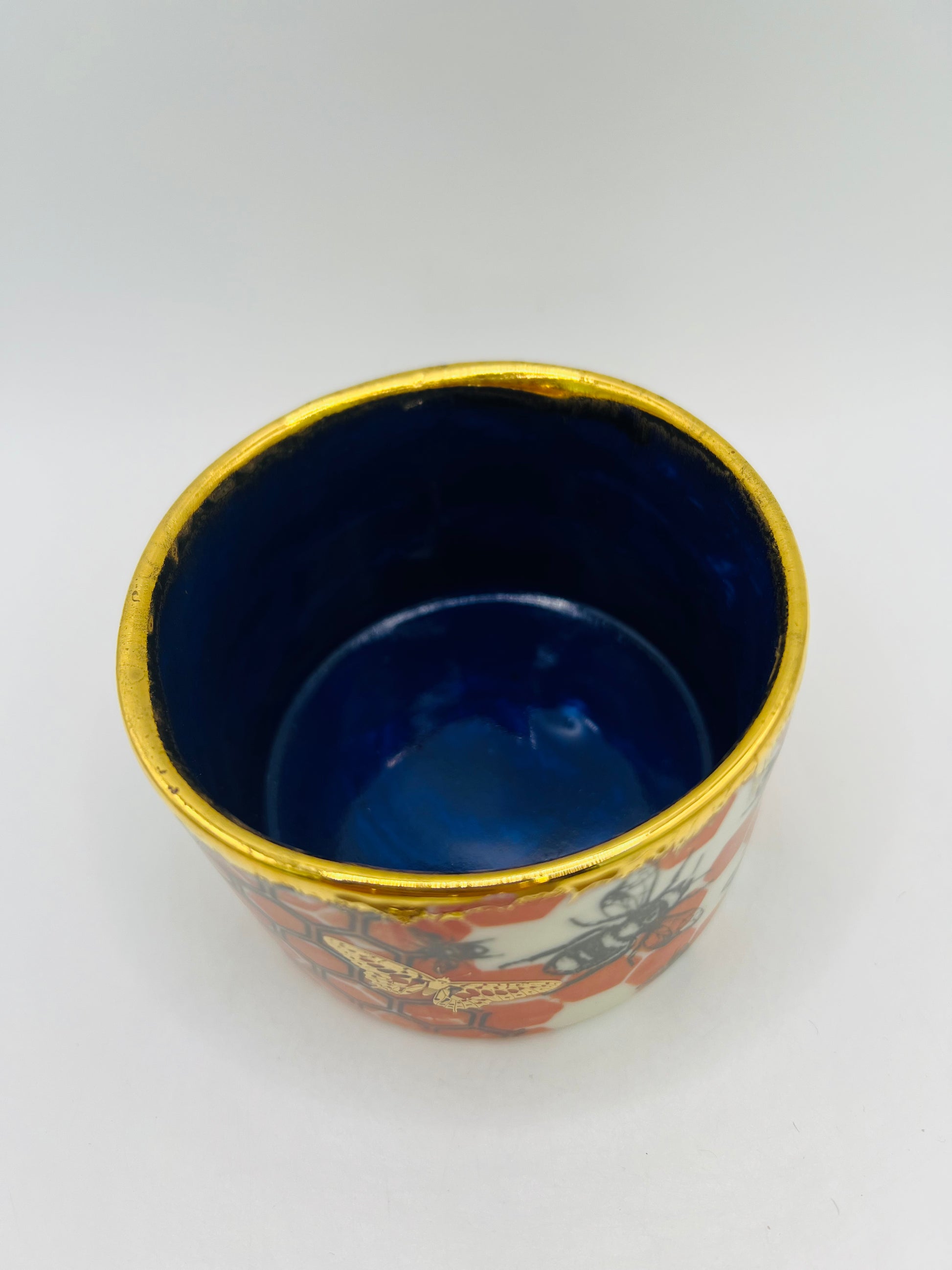 We've got all sorts going on for the decoration of this one; ALL SORTS I SAY! Beautiful 24 karat gold decals, screen-printed honeycomb pattern, beautiful deep teal blue glaze inside, a 24 karat gold rim and some lovely gold lustre smatterings!