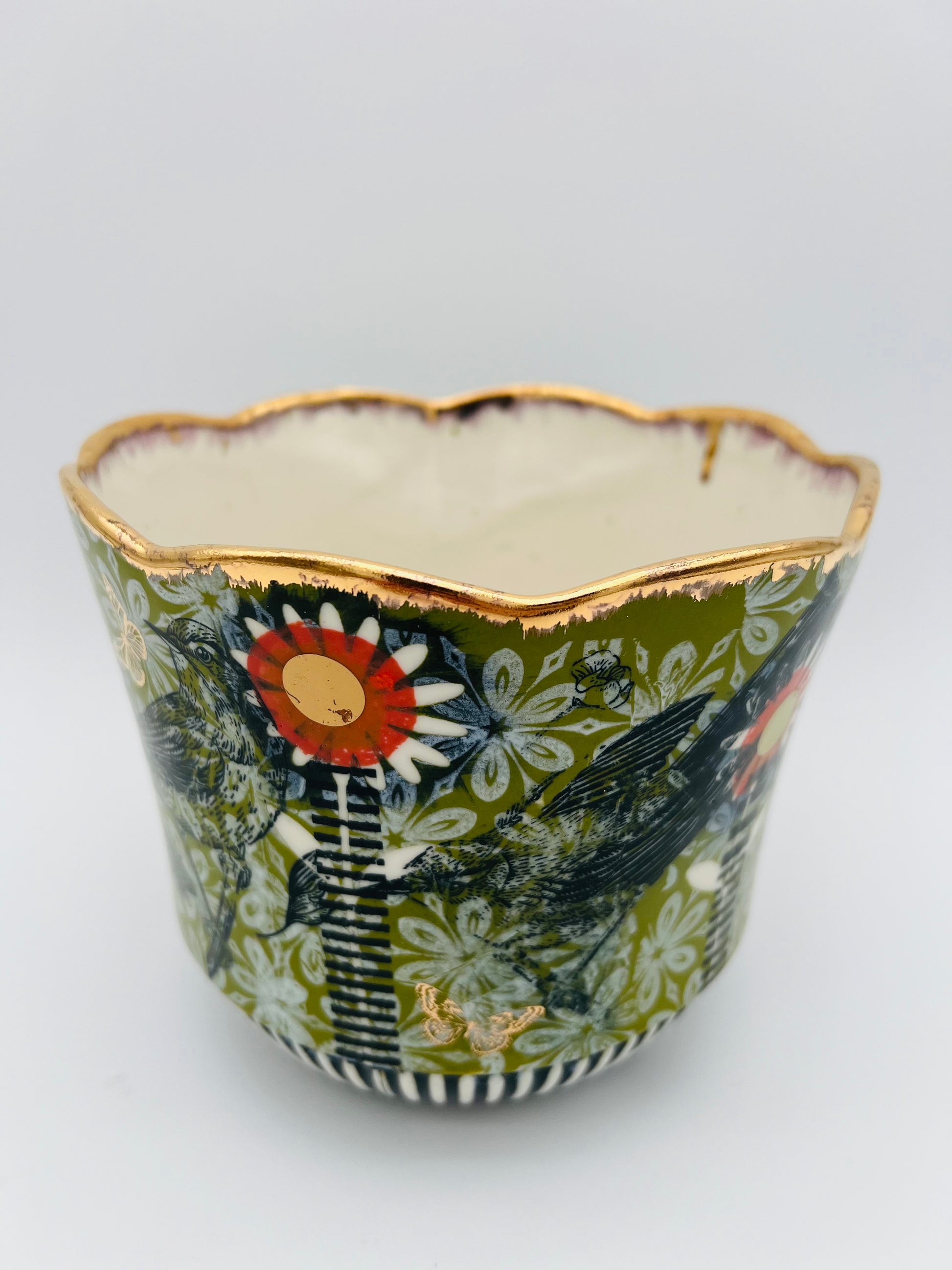 We have all sorts going on; screen-print, resist work, underglaze transfer, 24 karat gold lustre and insects! All of the techniques, just how I like it!